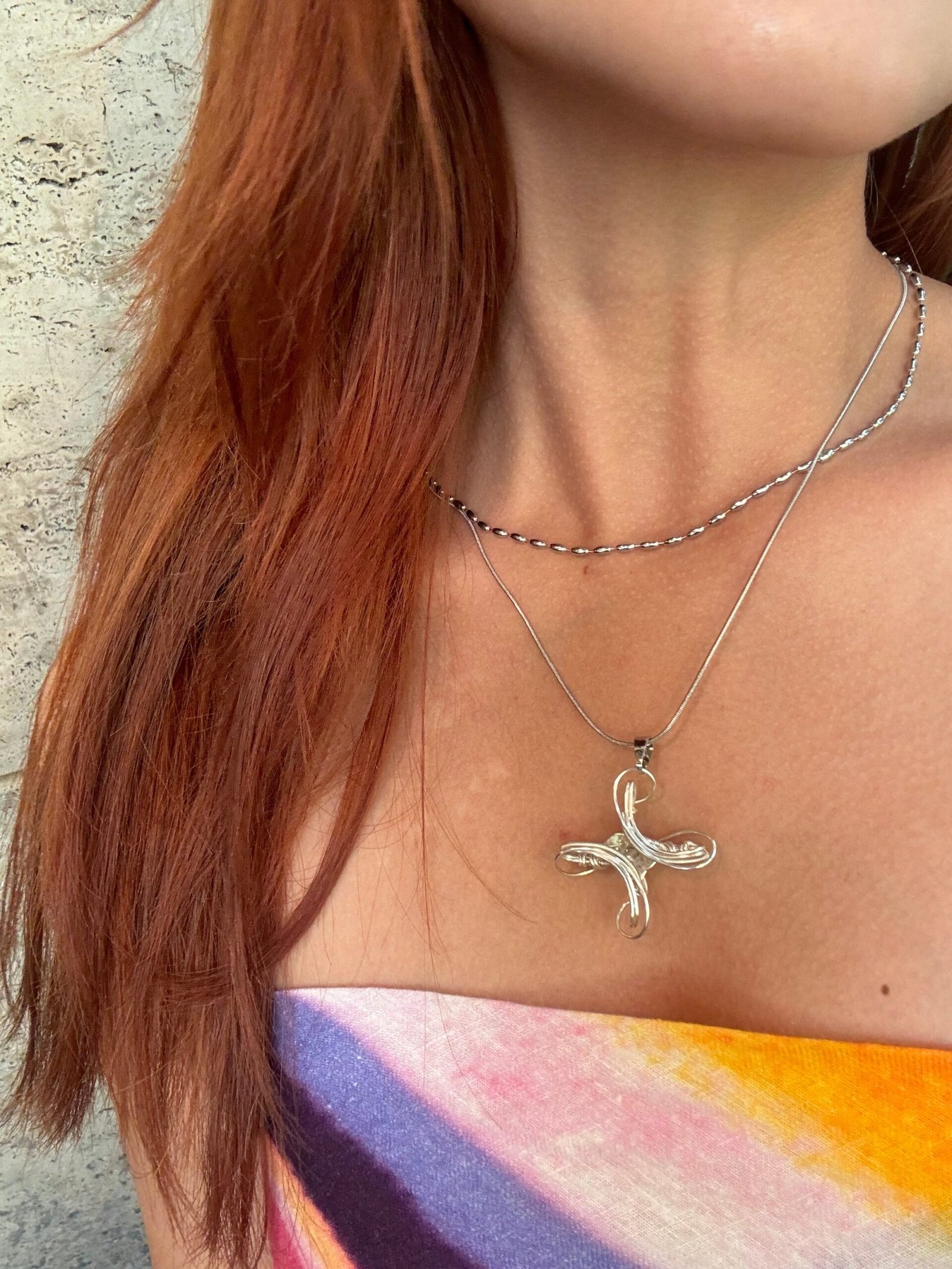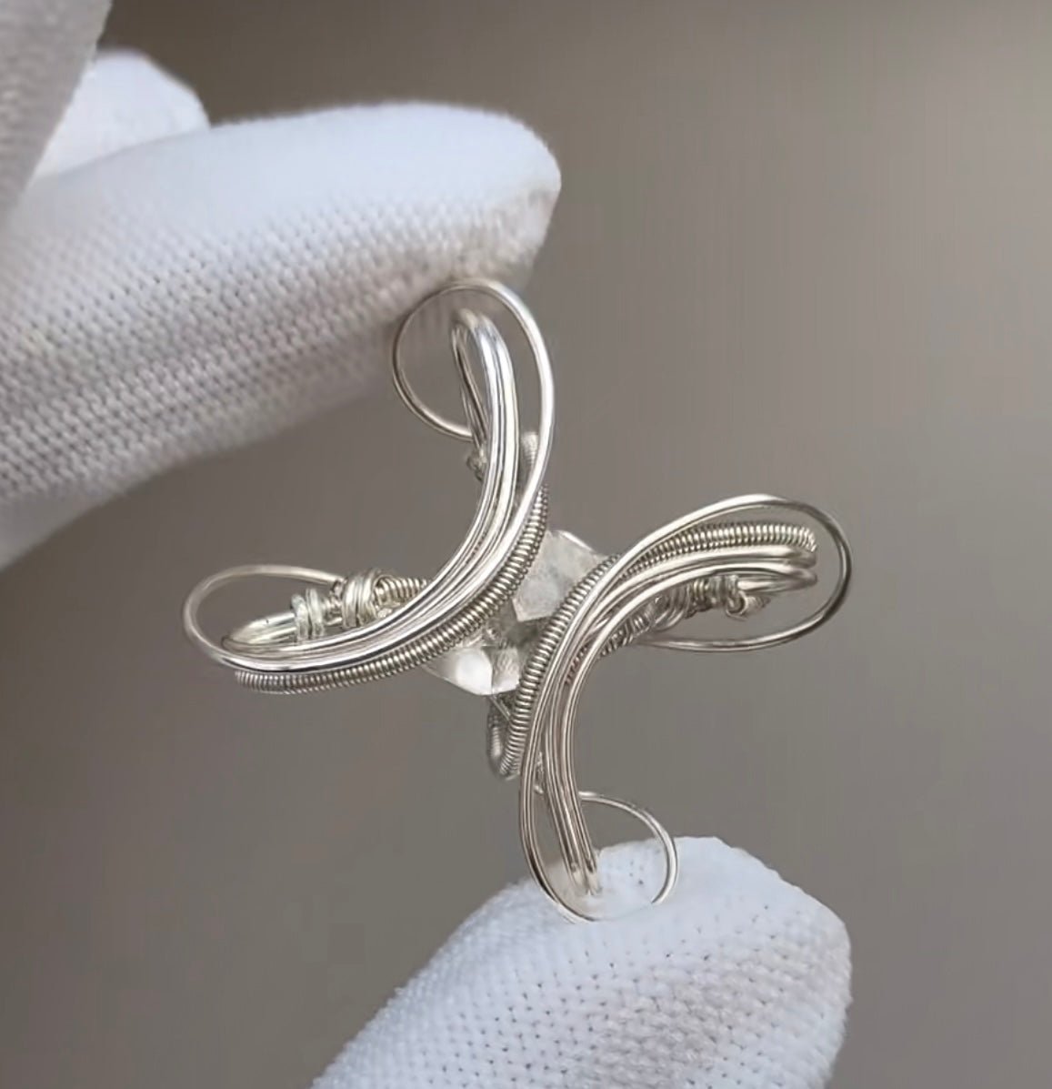The design draws inspiration from the fluidity of natural elements—specifically the gentle swirl of wind through a meadow and the soft ripples of water on a calm lake. I wanted to capture the sense of movement and light that defines these natural phenomena, using the clear crystal to represent the glint of sunlight on water or the transparency of a breeze. The winding silver wire is crafted to mirror the organic, unstructured flow of nature, creating a piece that feels both delicate and dynamic, a wearable reminder of nature’s quiet beauty and endless motion.