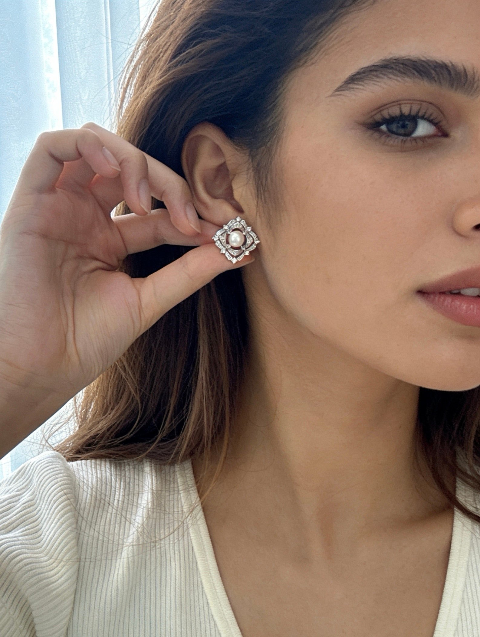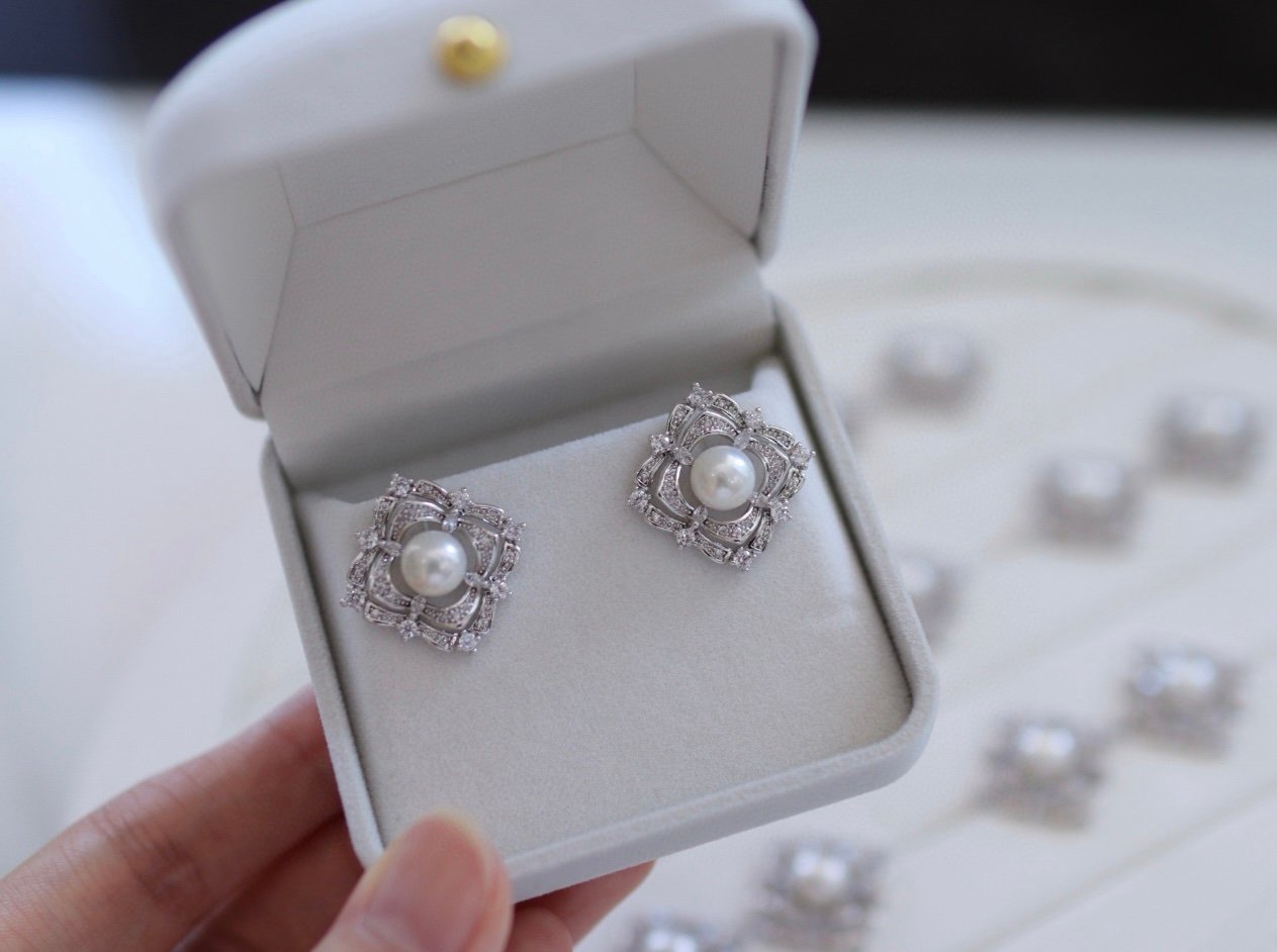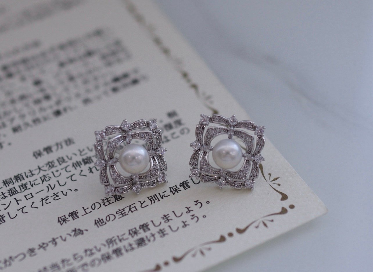 The square lace-like hollow frame is adorned with exquisite zircons, a round natural pearl sits firmly at the center, the retro carved texture blends with the bright sparkle, instantly amplifying your aura.