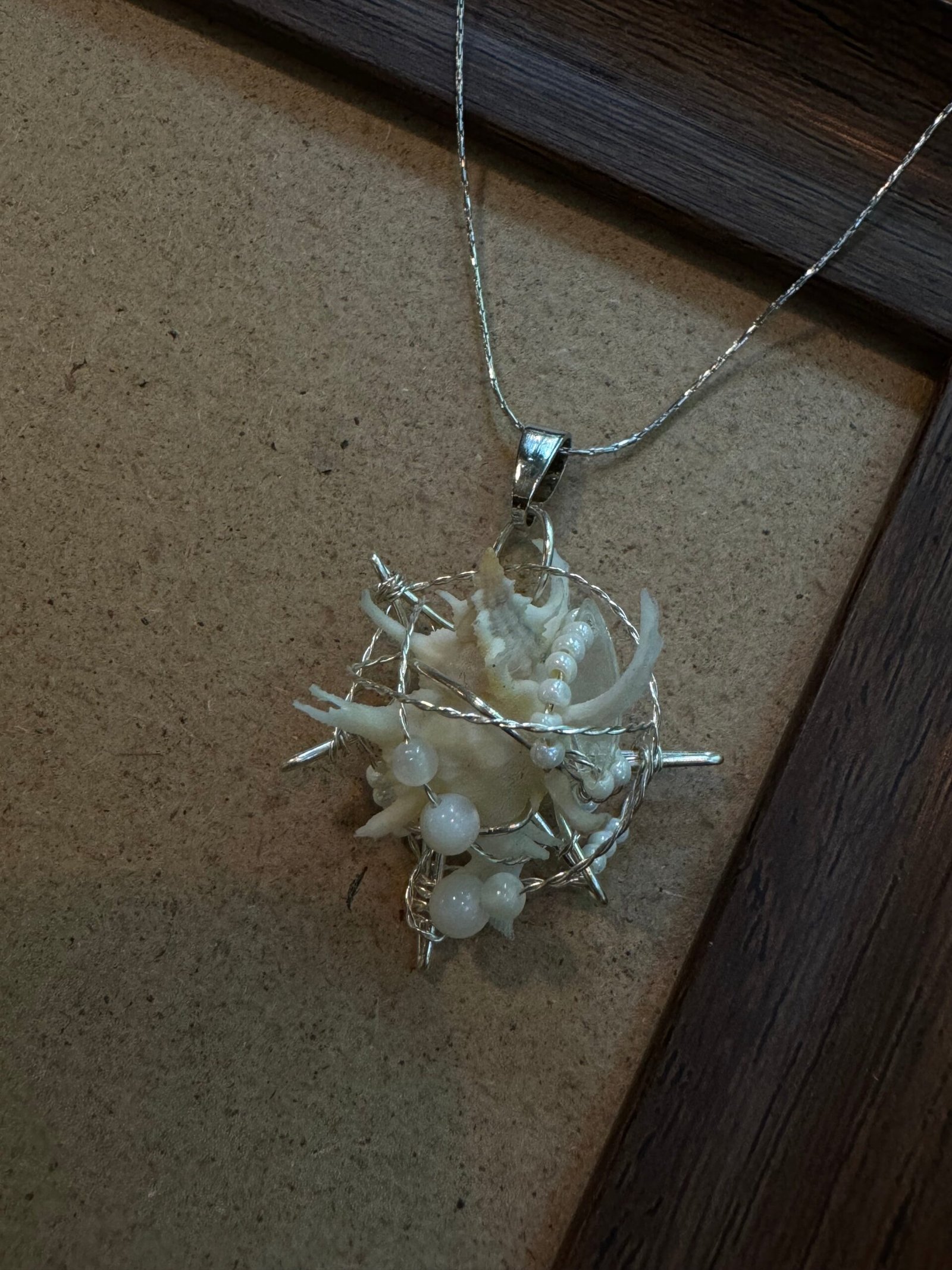 The design of this necklace is inspired by the illusory shell nebula in the deep sea—when sunlight pierces through the seawater, tiny shell fragments float and disperse in the ocean currents, creating a hazy and dreamlike scene just like a cosmic nebula. I used silver wire to mimic the ethereal outline of a nebula with irregular wrapping, encasing the broken shell pieces within it. This not only preserves the natural texture and feel of the shells but also creates a romantic atmosphere as if the nebula is embracing the stars. It aims to express that ordinary shell fragments can shine as brightly as a nebula, just like the small beautiful moments in life that come together to form a unique landscape.